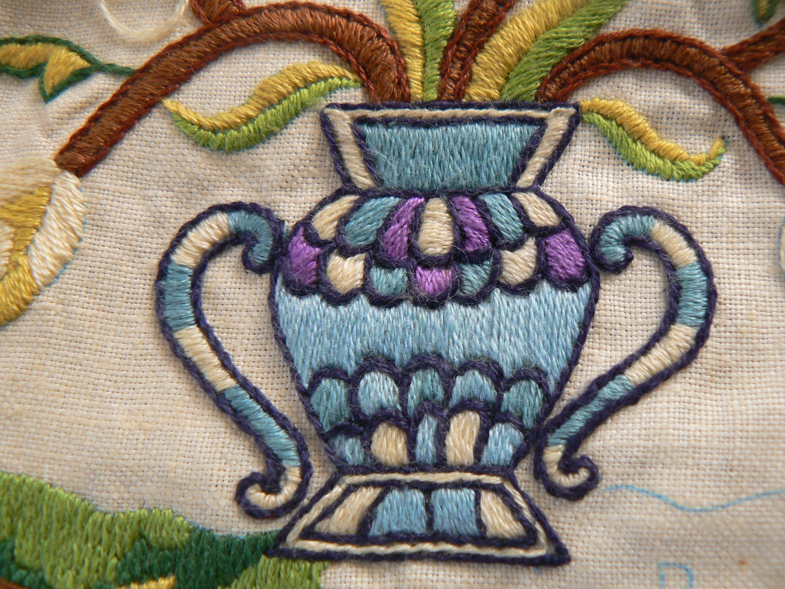 I really "urned" my stripes (no, I'm not sorry for that) with outlined satin stitches and every other stitch you can imagine (ok, no queen's stitches, which are my faves). This poor baby has been lying in wait in boxes during uncountable moves and in my cedar chest for decades. I've picked it up and looked at it, but no needle has pierced its surface for more than 30 years. You'd never know that this is one of the reasons I fell in love with stitching.