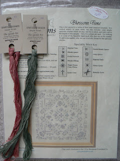 First is Blossom Time by Papillon Creations. This is a chart with some fabric that Mom bought for it. The fabric looks like a 28-count evenweave, but I haven't counted it, so it could be 32-count. Mom chose Gentle Art Sampler Threads in antique rose and grape leaf for this project, so I'll include those. Here's a picture: