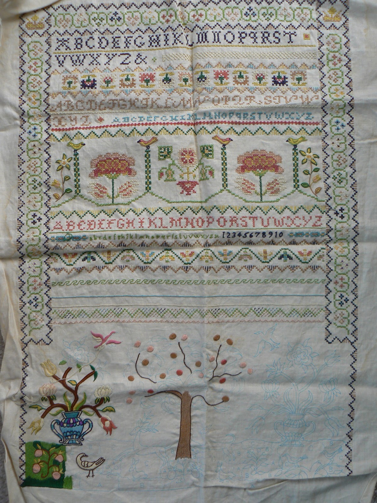 After reading Lee's past two Stitching Bloggers' Questions, I decided to combine them and tell you about my oldest project. January's SBQ asked about our oldest projects. Mine is this: